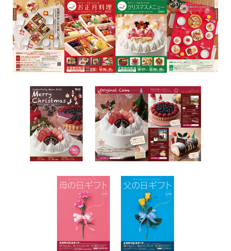 百貨店・総合スーパー・コンビニエンスストアのギフトカタログの制作にも多く携わりました。お歳暮・お中元・父の日・母の日・クリスマス・お正月等、季節毎のギフトをそれぞれの業態にあった表現で制作を進めました。
